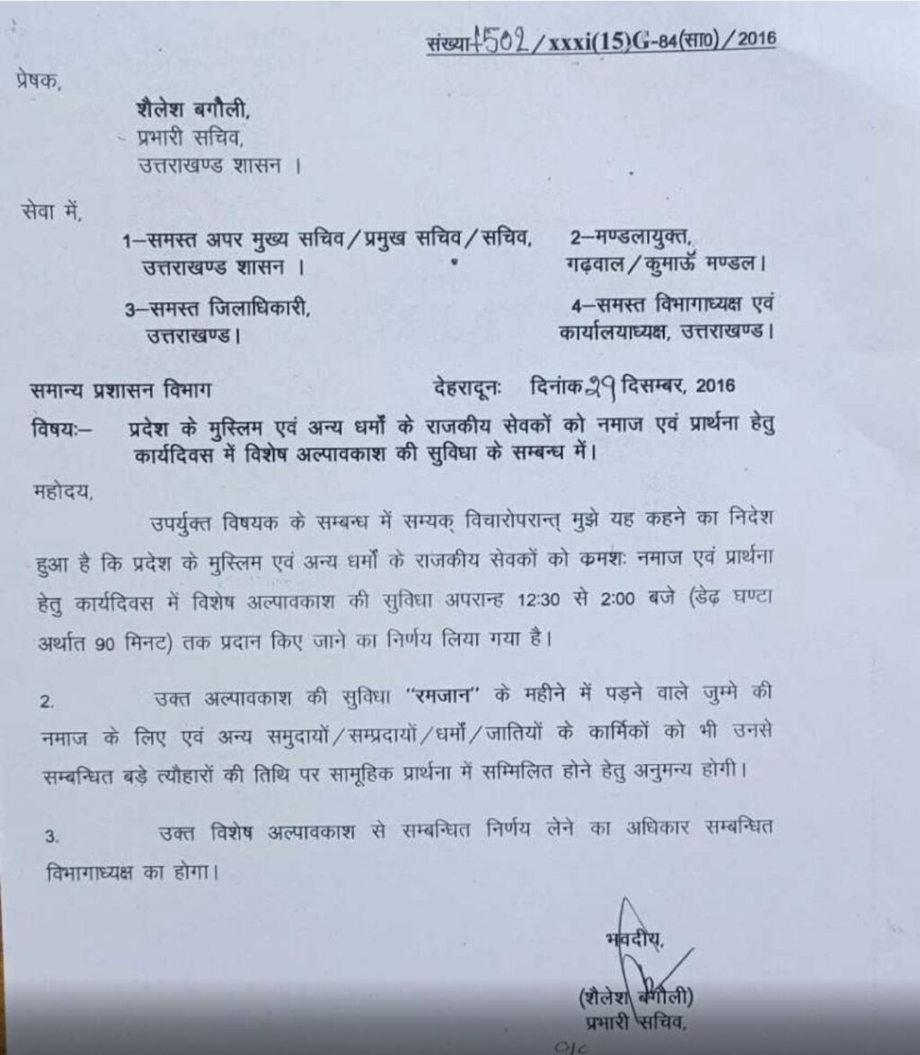 अब भाजपा नेता अजेंद्र अजय ने ट्विटर पर हरीश रावत के मुख्यमंत्रित्वकाल में जारी एक आदेश की प्रति साझा की है। इसमें रमजान के महीने में पडऩे वाले जुमे की नमाज के लिए और अन्य समुदायों, संप्रदायों, धर्माेें व जातियों के कार्मिकों को भी उनसे संबंधित बड़े त्योहारों की तिथि पर सामूहिक प्रार्थना में सम्मिलित होने को विशेष अल्पावकाश (90 मिनट) की अनुमति दिए जाने की बात कही गई है। आदेश में यह भी कहा गया कि विशेष अल्पावकाश से संबंधित निर्णय लेने का अधिकार विभागाध्यक्ष का होगा। भाजपा नेता अजेंद्र ने कहा कि हरीश रावत को प्रमाण दे दिया गया है। साथ ही पूछा है कि अब वह संन्यास की घोषणा कर करेंगे या फिर झूठी बयानबाजी तक सीमित रहेंगे।